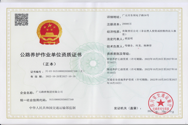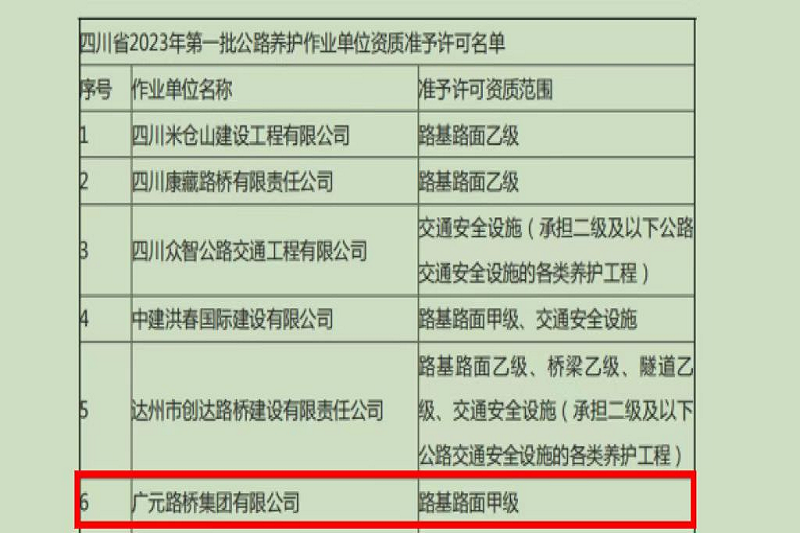 再添喜報(bào)!2023年2月16日,四川省交通運(yùn)輸廳官網(wǎng)公布了《四川省2023年第一批公路養(yǎng)護(hù)作業(yè)單位資質(zhì)準(zhǔn)予許可名單》,廣元路橋集團(tuán)有限公司位列其中。至此,廣元路橋集團(tuán)有限公司成功獲得路基路面甲級、橋梁乙級、交通安全設(shè)施、隧道乙級4項(xiàng)公路養(yǎng)護(hù)作業(yè)資質(zhì),成為我市第一家、也是唯一一家取得上述公路養(yǎng)護(hù)作業(yè)資質(zhì)的市屬國有企業(yè)。