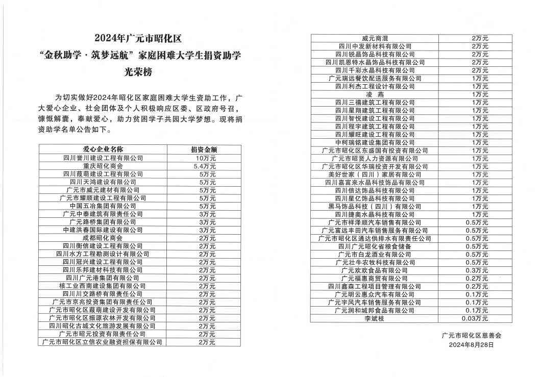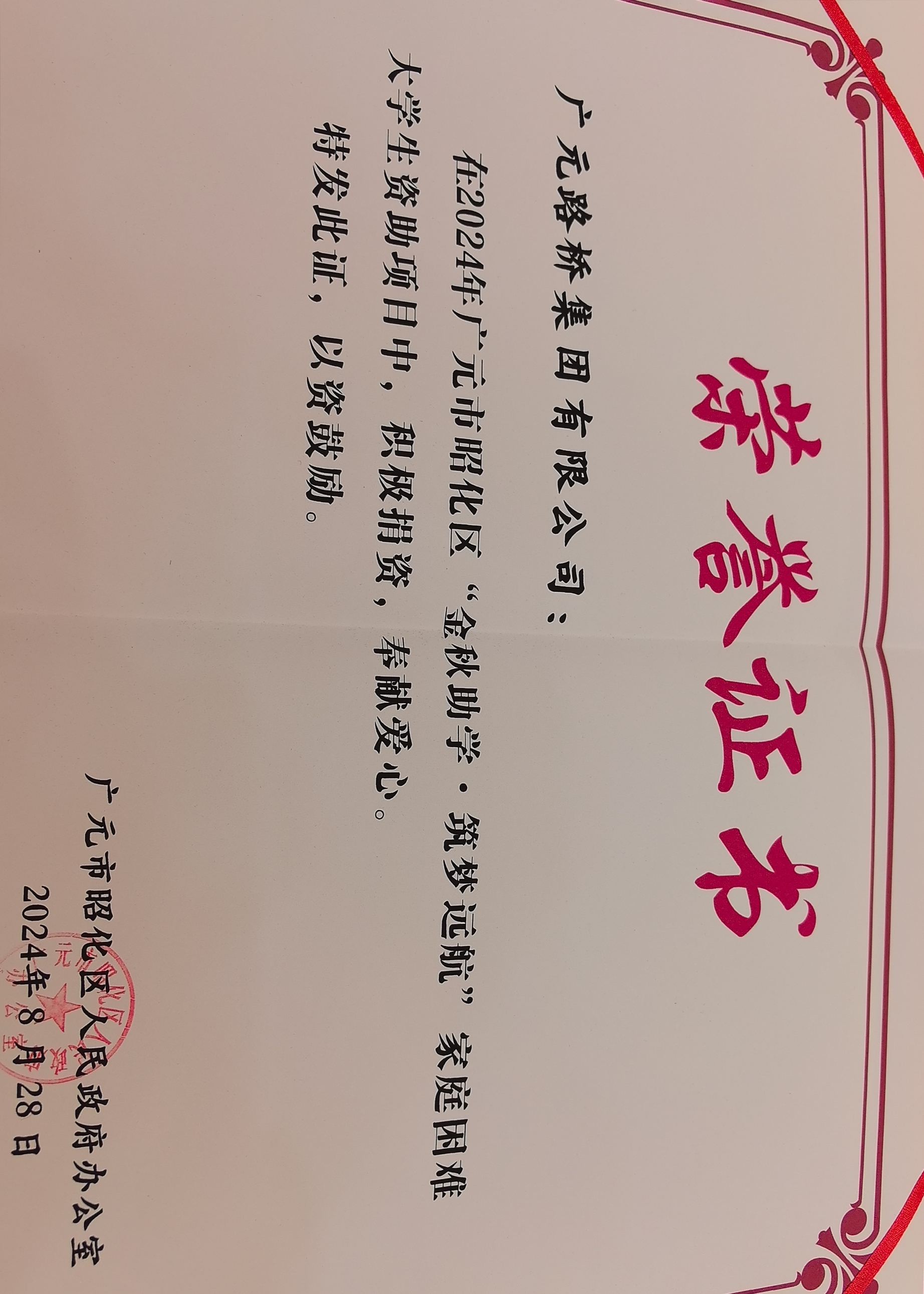 8月28日,昭化區(qū)舉行2024年“金秋助學(xué)·筑夢(mèng)遠(yuǎn)航”家庭困難大學(xué)生資助儀式,路橋集團(tuán)作為資助企業(yè)參會(huì)并獲得表彰。